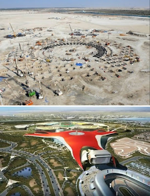 Ferrari World (Abu Dhabi): a high tech park inspired in FerrarrisLocated just across from Iran, the nearly-completed Ferrari World Theme Park sits on Abu Dhabi's largest natural island. It's a "high-tech" theme park featuring simulator rides, roller coasters, an interactive museum and a theatre with an Italian-themed play and a race track, as part of the $40 billion dollar transformation into one of the world's premier luxury tourist destinations. Work only began on the 4,200 acre facility in November, 2007, but as things have a way of doing in the UAE, work is progressing incredibly rapidly. Ferrari World is scheduled for completion this November. An amazing process from Sarlacc pit-like sand trap to prancing stallion princess castle!